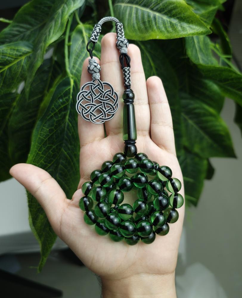 سبحة بكلايت اخضر شفاف خيط اسود طربزونة نحاس