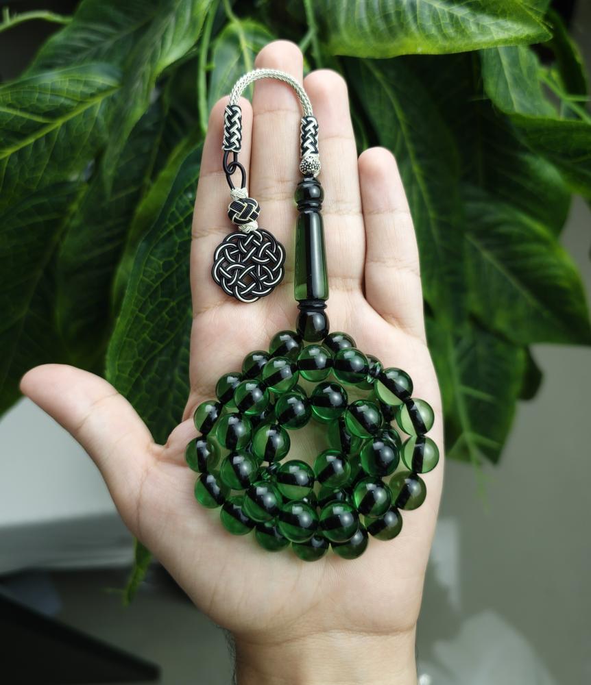 سبحة بكلايت اخضر شفاف خيط اسود طربزونة نحاس